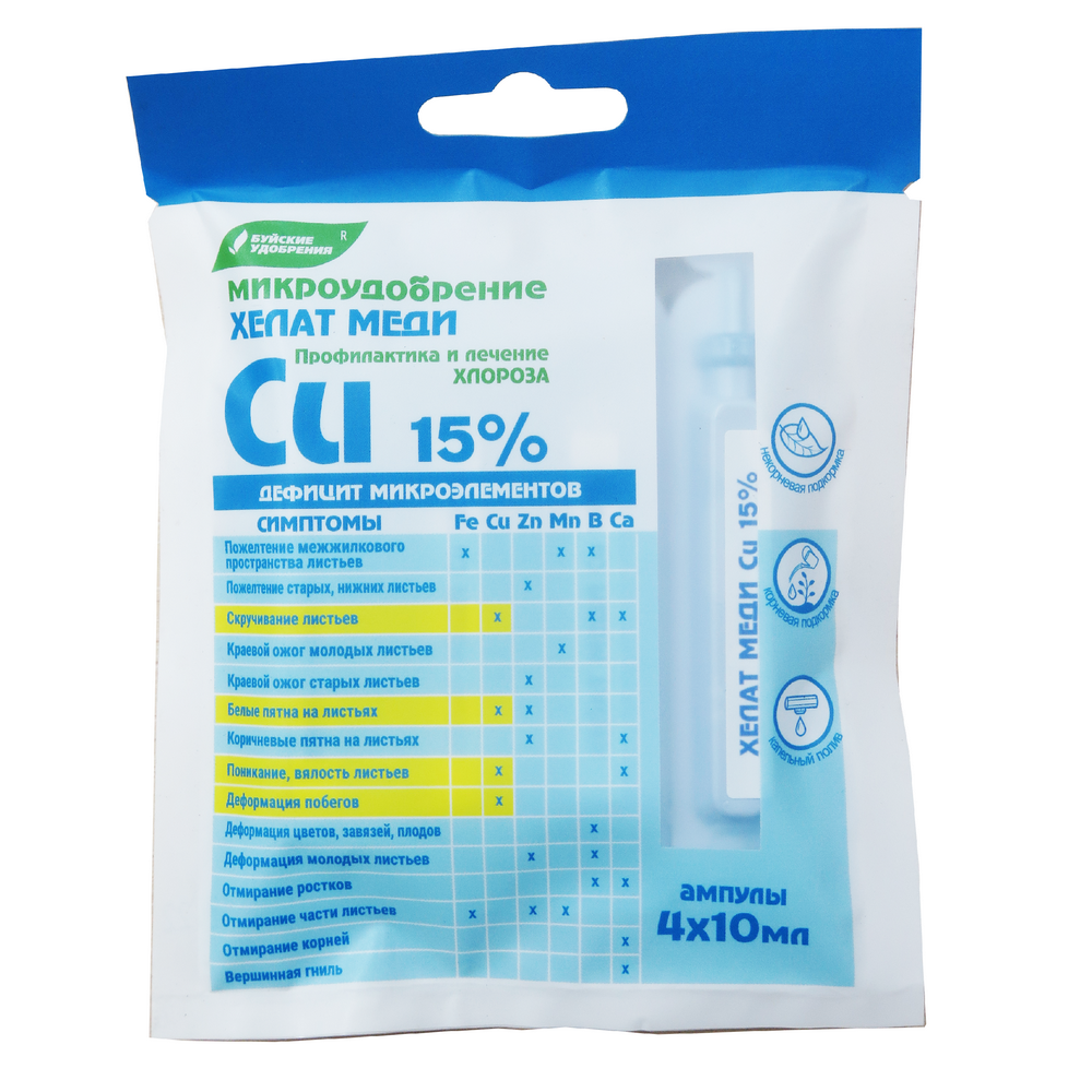 Микроудобрение "Хелат меди" в форме ампул (4 ампулы по 10 мл каждая) — это специализированное удобрение, предназначенное для предотвращения и лечения дефицита меди у растений. Медь является важным микроэлементом, участвующим в процессах фотосинтеза, дыхания и синтеза белков, а также играет ключевую роль в укреплении клеточных стенок и повышении устойчивости растений к болезням.