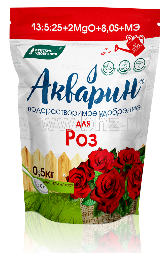 Акварин для роз - водорастворимое удобрение, в состав которого входит азот, фосфор, калий, магний, сера и микроэлементы – железо, цинк, марганец, медь в хелатной форме, а бор и молибден – в минеральной. Благодаря кислой реакции (рН) удобрения, оно легко растворяется в холодной воде и более эффективно усваивается корневой системой или листовой поверхностью растений.
