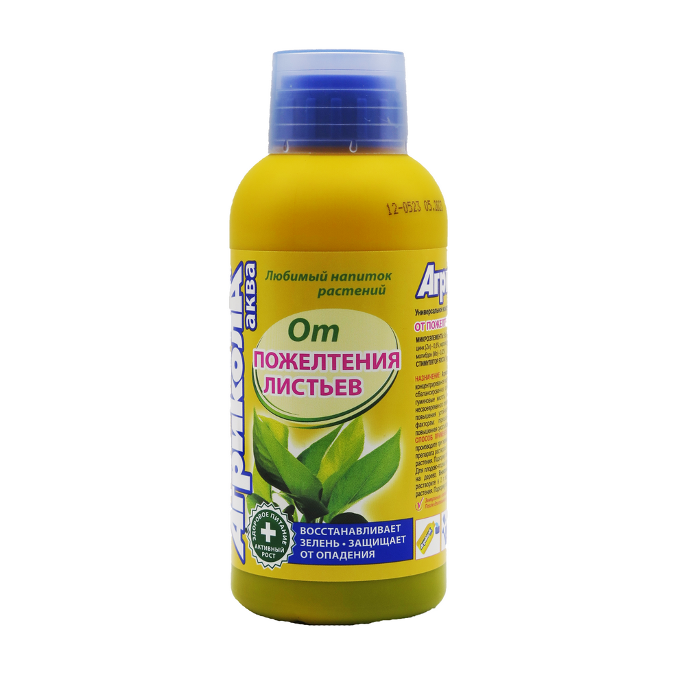 Пожелтение листьев может быть вызвано различными факторами, средство насыщает растения питательными веществами, расход 1 флакон на 100 л.