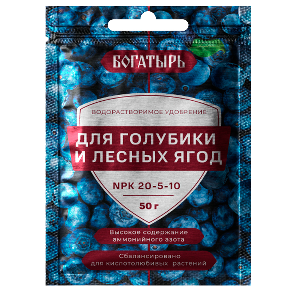 Водорастворимое удобрение Богатырь для голубики и лесных ягод 50 гр – это специализированное удобрение, разработанное для обеспечения оптимального питания голубики и других лесных ягод. Оно содержит сбалансированный комплекс макро- и микроэлементов, необходимых для здорового роста и плодоношения растений.