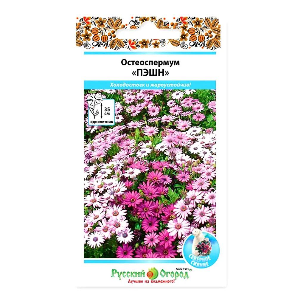 Остеоспермум "Снежная Королева" – очаровательная смесь низкорослых, похожих на ромашки цветов, создающих живописный, плотный ковер в вашем саду. Эта разновидность представлена в двух нежных оттенках: мягком розовом с лиловой сердцевиной и насыщенном цвете фуксии с темно-бордовым центром. "Снежная Королева" идеально подходит для оформления бордюров в сочетании с хостами, астрами, петуниями и маттиолой. Она также прекрасно смотрится у пергол и других малых архитектурных форм, где растут клематисы или плетистые розы. Многие предпочитают размещать эти цветы небольшими группами в зонах отдыха, создавая впечатление естественного произрастания. Благодаря нежной расцветке, "Снежная Королева" легко сочетается с разнообразными растениями, включая кустарники и карликовые деревья. Выращивание рассады рекомендуется начинать в конце марта.