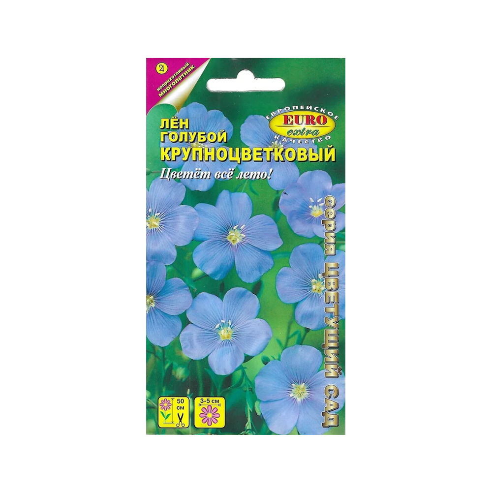 Неприхотливое растение из семейства Льновые высотой 50 см. Цветет в июне-августе. Цветки диаметром 3-4 см, голубого цвета, собраны в эффектные соцветия. Холодостоек, неприхотлив, предпочитает солнечные участки с легкими почвами без застоя воды. Размножают прямым посевом в открытый грунт весной или под зиму. Всходы прореживают на расстоянии 10 см. Используют для оформления участка, лучше сажать группами. Для букетов лен выдергивают с корнем в фазе бутонизации, обрезают корни и сразу ставят в воду.