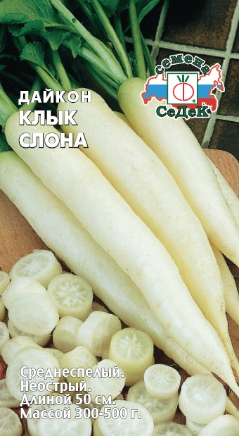 Среднеспелый Не острый Длиной 50 см. Массой 300-500 г. Среднеспелый (от полных всходов до хозяйственной годности 70-90 дней) сорт. Корнеплоды удлинен-но-цилиндрические, белые, у головки светло-зеленые, длиной до 50 см, массой 300-500 г. Мякоть белая, сочная, без острого редечного вкуса. Корнеплод на 2/3 погружен в почву и легко выдергивается при уборке. Урожайность 3,2-4 кг/м2.
