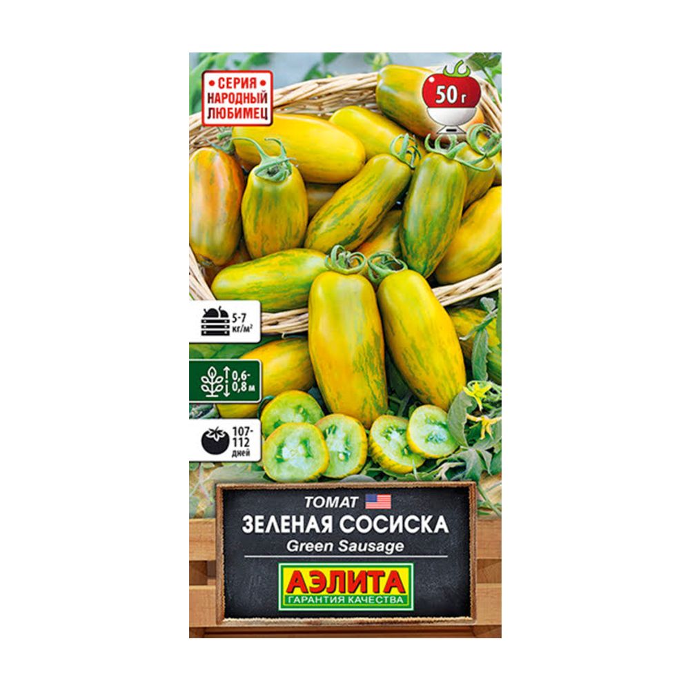 "Зеленая сосиска" – это среднеранний сорт томатов, который получил мировую известность под своим оригинальным названием Green Sausage. Родом из США, он моментально стал популярным благодаря своей необычной внешности. Эти выносливые, детерминантные растения (60-65 см в открытом грунте, до 70-80 см в теплице) порадуют вас урожаем примерно через 107-112 дней. Плоды имеют продолговатую форму, весят около 50 г.