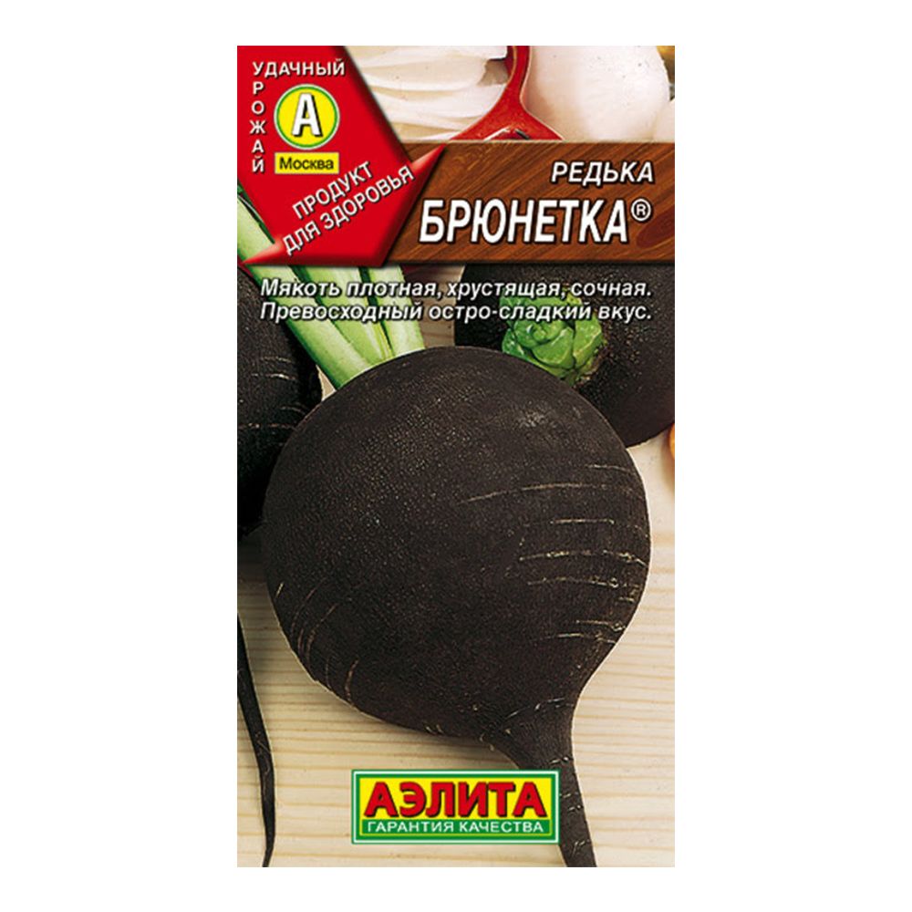 Представляем сорт редьки 'Брюнетка' – надежный выбор для получения обильного урожая за 90-110 дней. Эти округлые, гладкие корнеплоды весом 280-320 граммов порадуют вас плотной, хрустящей и очень сочной мякотью с пикантным остро-сладким вкусом. 'Брюнетка' обладает выраженными противомикробными свойствами, что делает ее ценным продуктом для свежего потребления. Для смягчения жгучести можно использовать сметану, мед или масло. Молодая зелень также годится для салатов и супов. Редька – признанное народное средство для укрепления иммунитета, особенно актуальное в сезон простуд. Корнеплоды отлично хранятся, а урожайность составляет 5-7.5 кг/м². Для летнего потребления сейте в конце апреля, для зимнего – в середине июня, на глубину 2 см. После появления 2-3 листьев проредите, оставляя 15 см между растениями. Убирайте урожай по мере созревания.