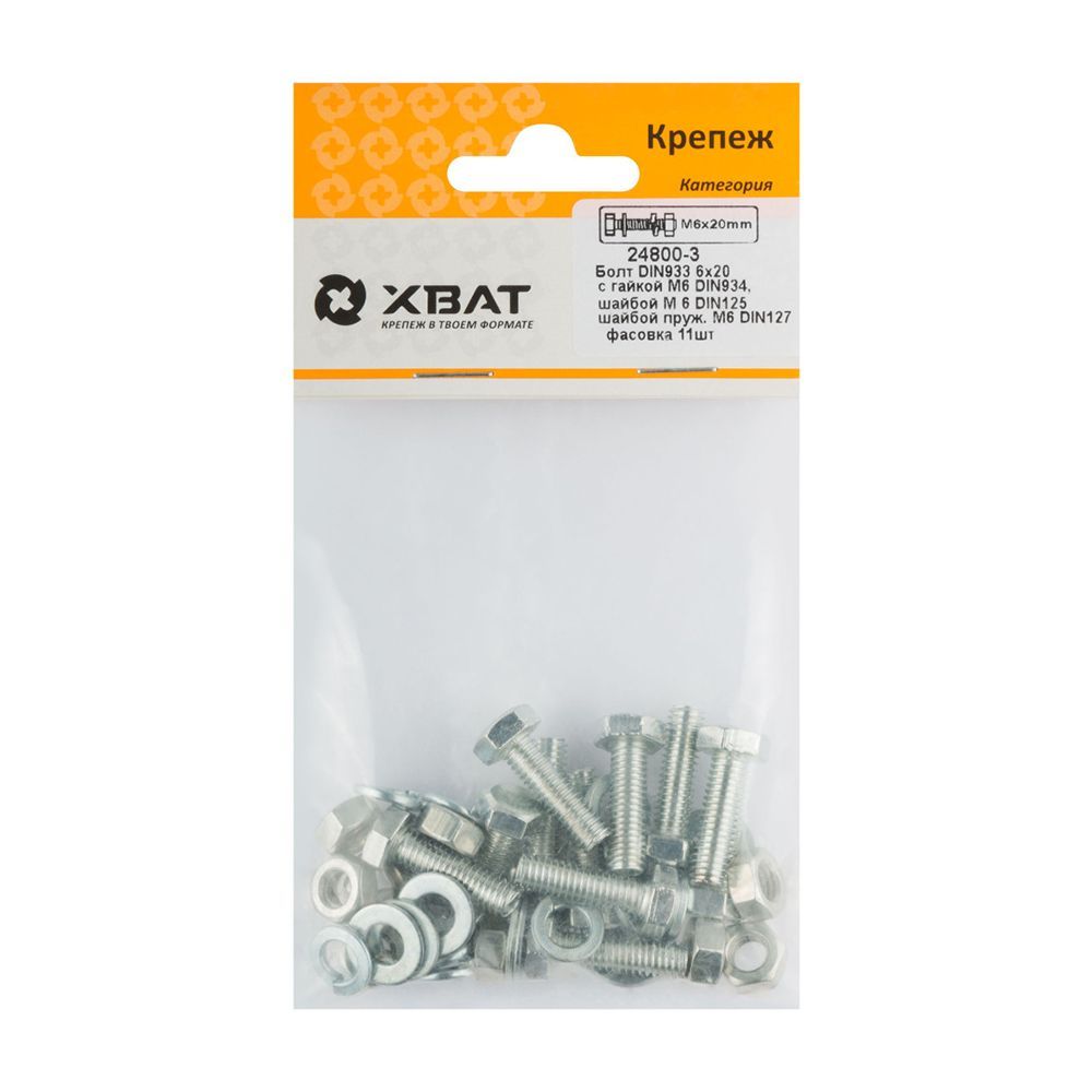 Комплект:Болт DIN933 6х20, с гайкой М6 DIN934, шайбой М 6 DIN125, шайбой пруж. М6 DIN127 (фасовка 11шт.)
