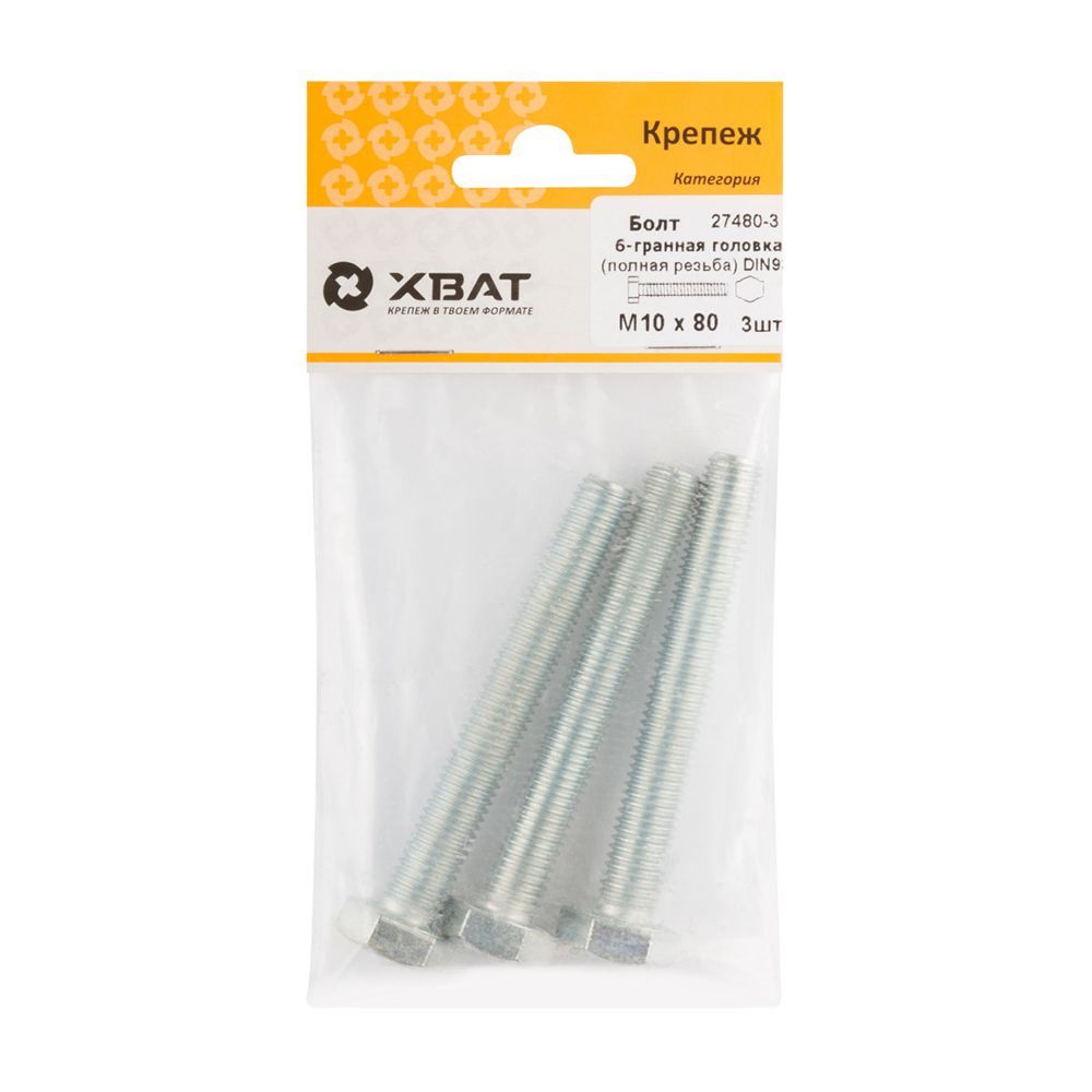 Болт 6-гранная головка (полная резьба) М10 х 80 DIN933 (фасовка 3 шт.)