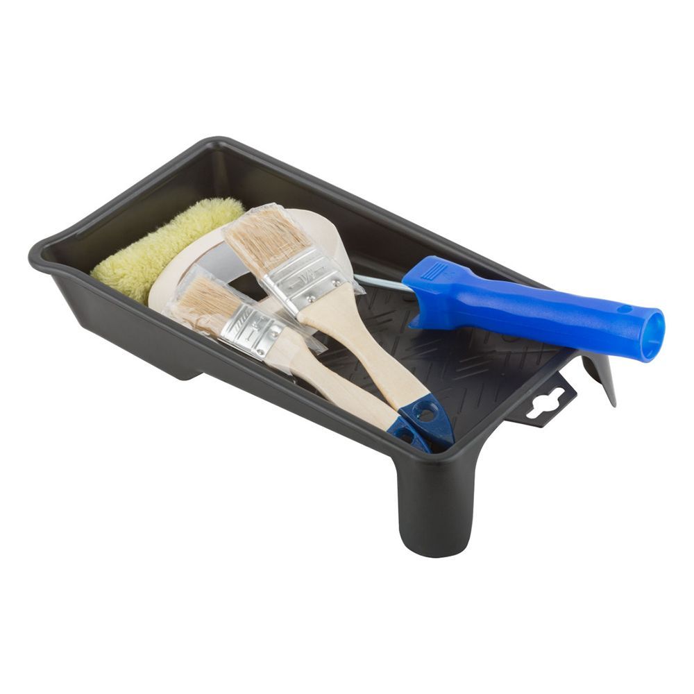 2 флейцевые кисти - 25 мм, 38 мм; валик полиакриловый - 100 мм, D 15/35; лента малярная - 25 мм х 50 м; ванночка пластиковая - 290 х 150 мм.