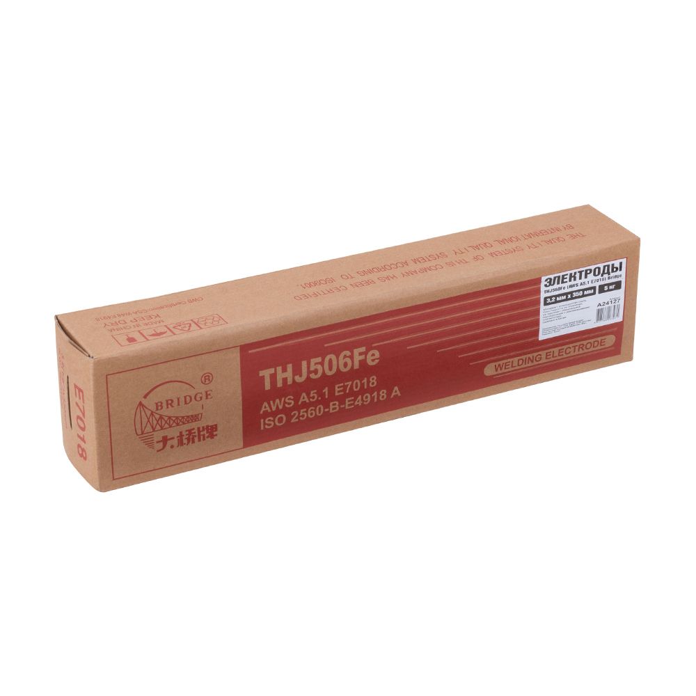 Сварочные электроды BRIDGE THJ506Fe характеризуются основным типом покрытия, обеспечивающим низкое выделение водорода. Они совместимы с источниками питания как переменного, так и постоянного тока. Основное применение – сварка углеродистых и низколегированных сталей, в частности, марок с классом прочности Q355 (например, Gr 50). Продукция сертифицирована по стандартам GB/T 5117 E5018, AWS A5.1 E7018 и ISO 2560-B-E4918 A. Электроды допускают сварку во всех основных пространственных положениях: PA, PB, PC, PD, PE, PF.
