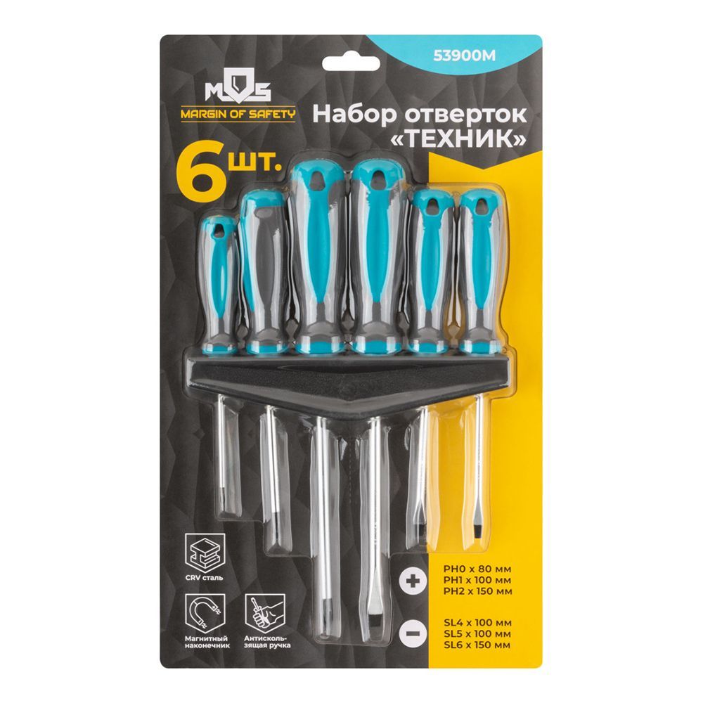 Набор отверток "Техник". В комплекте вы найдете все необходимое: крестовые отвертки PH0 (80 мм), PH1 (100 мм) и PH2 (150 мм), а также шлицевые отвертки SL4 (100 мм), SL5 (100 мм) и SL6 (150 мм). Все отвертки удобно расположены на специальном пластиковом держателе. Жало каждой отвертки выполнено из прочной хром-ванадиевой стали и оснащено магнитным наконечником для надежного удержания крепежа. Эргономичные прорезиненные ручки обеспечивают комфортный и надежный захват, предотвращая скольжение. Упаковано в удобный блистер.