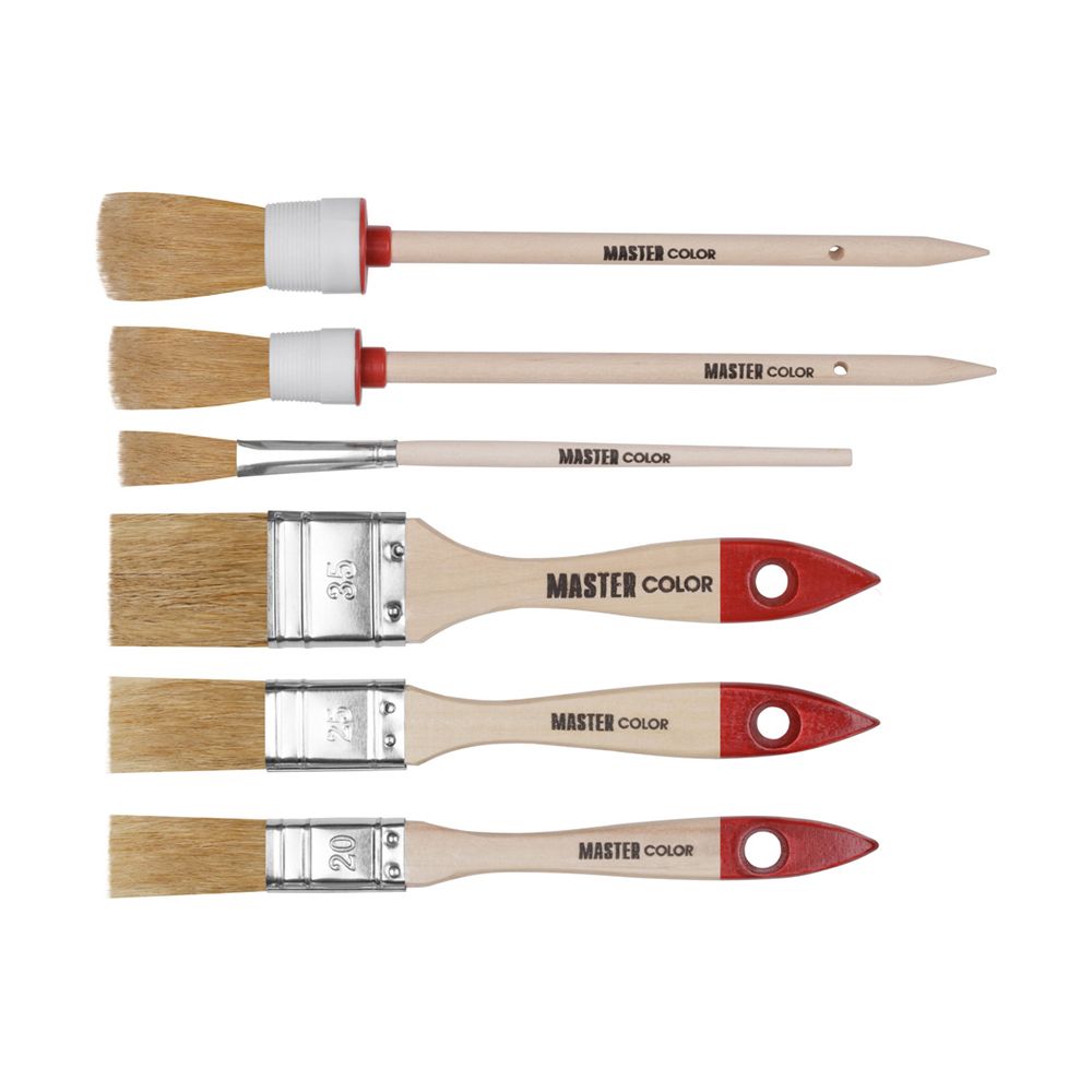 Набор из 6 кистей с деревянными ручками: флейц. кисть 20 мм, 25 мм, 35 мм (55% топс); круглая кисть