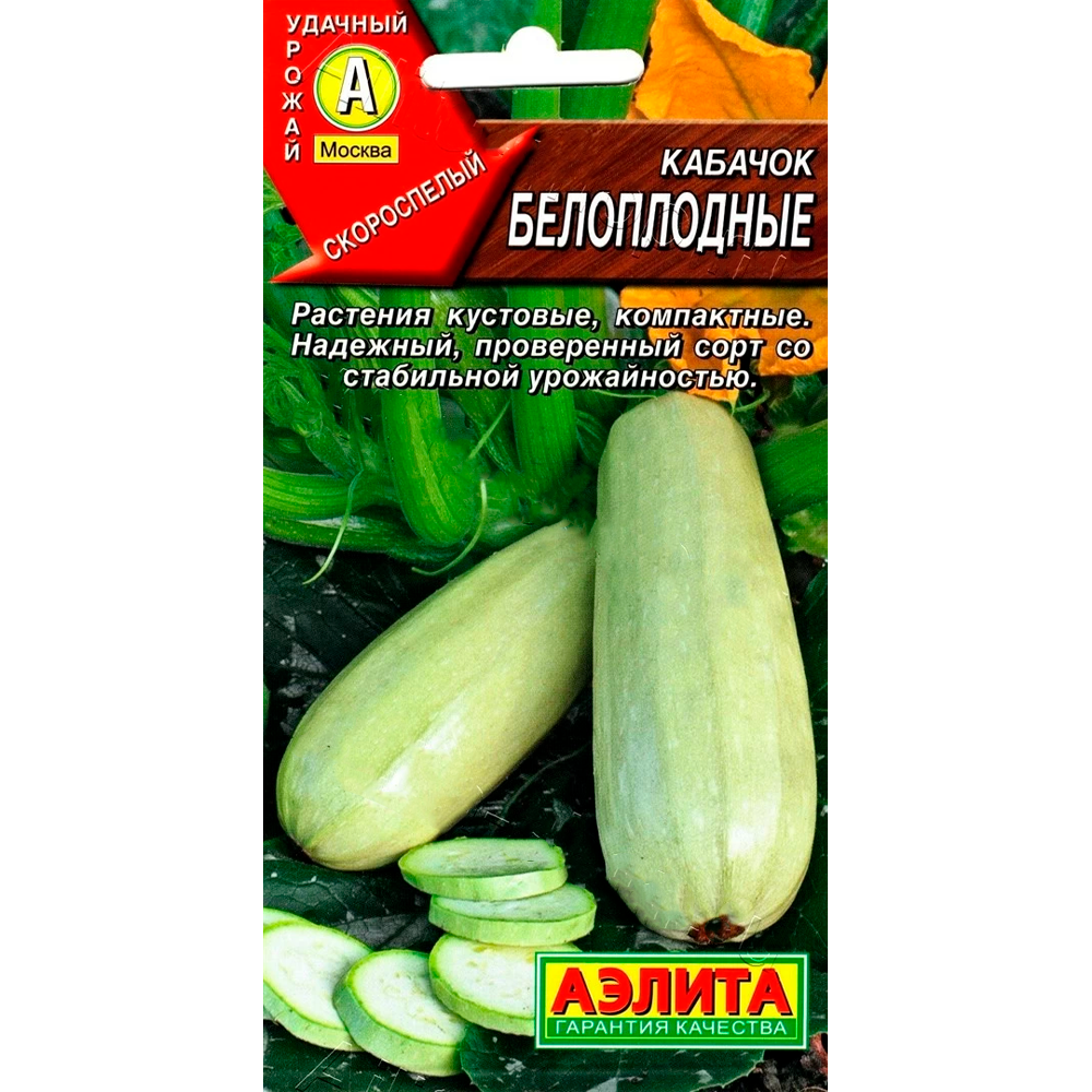 Скороспелый отечественный сорт (от всходов до первого сбора 36-41 день). Растения кустовые, компактные. Плод цилиндрический, гладкий, слаборебристый у основания, массой 0,6-0,9 кг, с тонкой белой корой. Мякоть белая, плотная, нежная, с отлич ными вкусовыми качествами. Товарная урожайность свыше 10 кг/м2. Плоды лежкие, с хорошей транспортабельностью. Устойчив к бактериозу. Кабачок – диетический продукт низкой калорийности, с богатейшим витаминно-минеральным комплексом, весьма полезен для профилактики и лечения избыточного веса, болезней печени, почек, сердечно-сосудистых заболеваний.