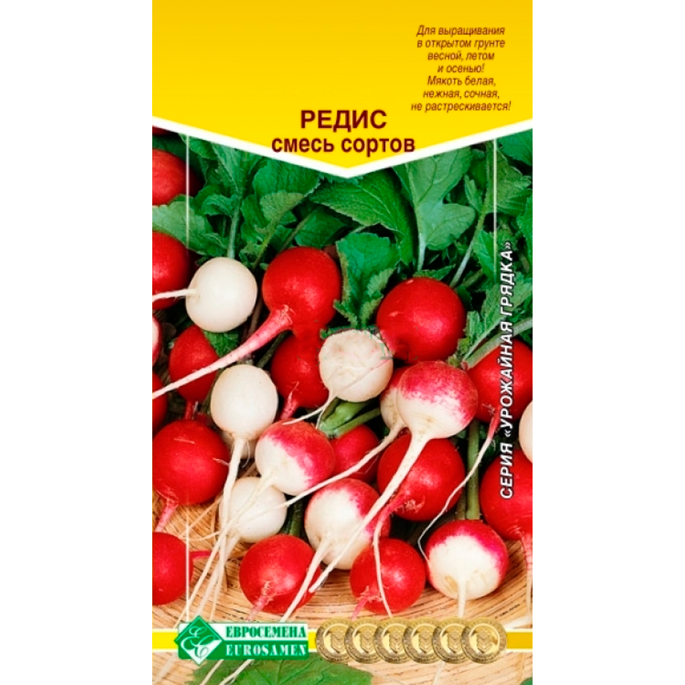 Урожайные, раннеспелые редисы; период от всходов до технической спелости 20-30 дней. Эта смесь представлена сортами Маяк, Октава и Родос. Корнеплоды ярко-красного, белого и красного с белым кончиком цвета, одинаковой округлой формы, различной массы от 15 до 35 г – в одном пакете! Но у всех этих сортов есть много общего: поверхность корнеплодов гладкая, мякоть белая, плотная и сочная, слабоострого вкуса. Все эти сорта хорошо повышают аппетит, улучшают пищеварение, долго сохраняют свои вкусовые качества после съема урожая, очень красивы в салате-ассорти.