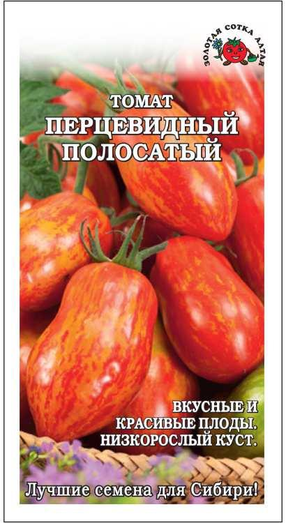 Среднеспелый кистевой сорт томата, дающий высокий урожай как при выращивании в теплице, так и в открытом грунте. Куст крепкий, детерминантный, хорошо облиственный, высотой в теплице около метра, в открытом грунте не выше 70 см. Формировать растения рекомендуется в 3-4 стебля. За сезон на кусте завязывается до 5 кистей по 6-9 помидоров. Плоды перцевидные, плотные, массой 80-120 г, в длину могу достигать 15 см, в стадии зрелости красные в золотистую извилистую полоску, очень красивые. Эти помидоры хороши для свежих салатов и консервации, при которой остаются плотными, не растрескиваются и не раскисают, цвет не меняют.