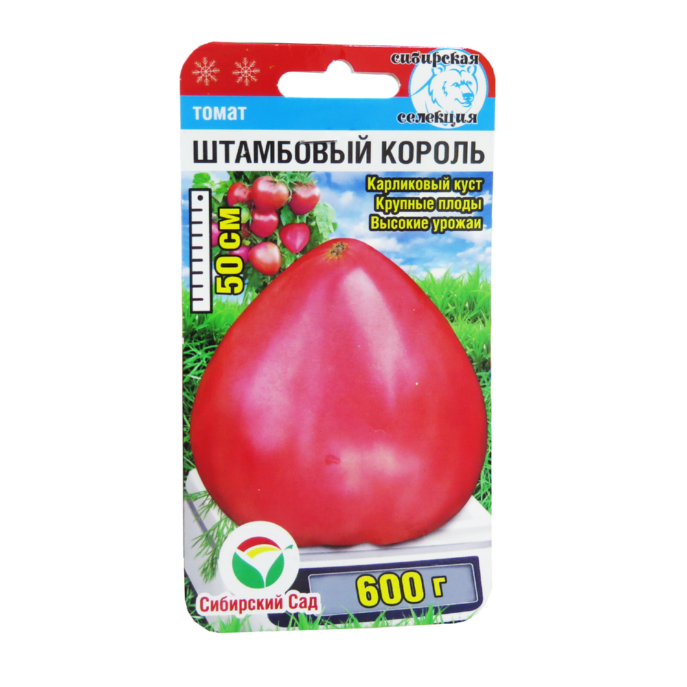 Среднеспелый крупноплодный штамбовый сорт селекции АФ «Сибирский сад» для открытого грунта, 100% приспособленный к условиям Сибири. При высоте растения не более 60 см с одного куста можно получить до ведра крупных вкусных сибирских томатов. Редкое сочетание неприхотливости, крупноплодности, суперурожайности позволяет назвать сорт настоящим томатным королем. Сорт выращивается без пасынкования, но без подвязки ломается под тяжестью созревающих плодов.