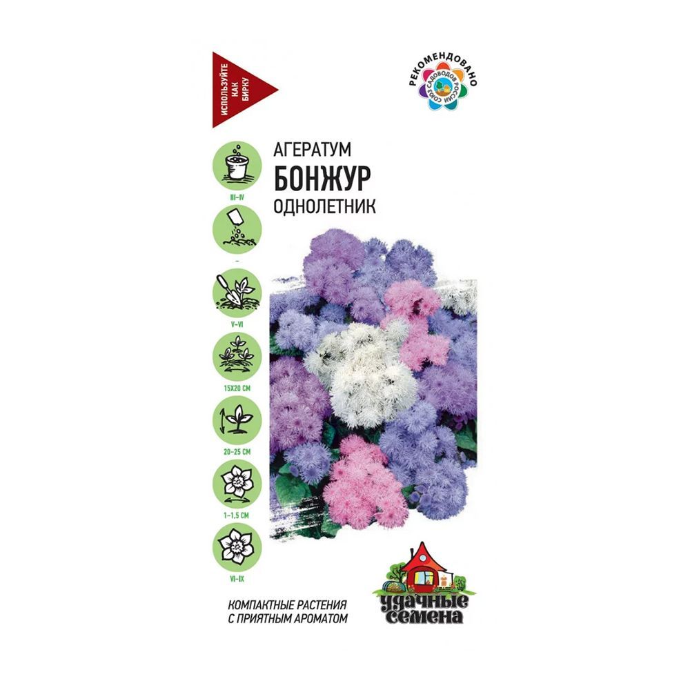 Эта смесь сортов – ваш выбор для долгого и эффектного цветения. Растения из семейства Астровых, высотой 20-25 см, образуют крупные, пушистые соцветия. Цветение обильное, с июня до заморозков. Отдельные цветочки мелкие (1-1,5 см), душистые, собраны в крупные щитковидные соцветия (до 8-10 см). Окраска разнообразная. Агератум засухоустойчив, светолюбив (допускается легкое затенение), предпочитает легкие, умеренно плодородные почвы. Теплолюбив, чувствителен к заморозкам. Отлично подходит для клумб, рабаток, миксбордеров и украшения балконов.
