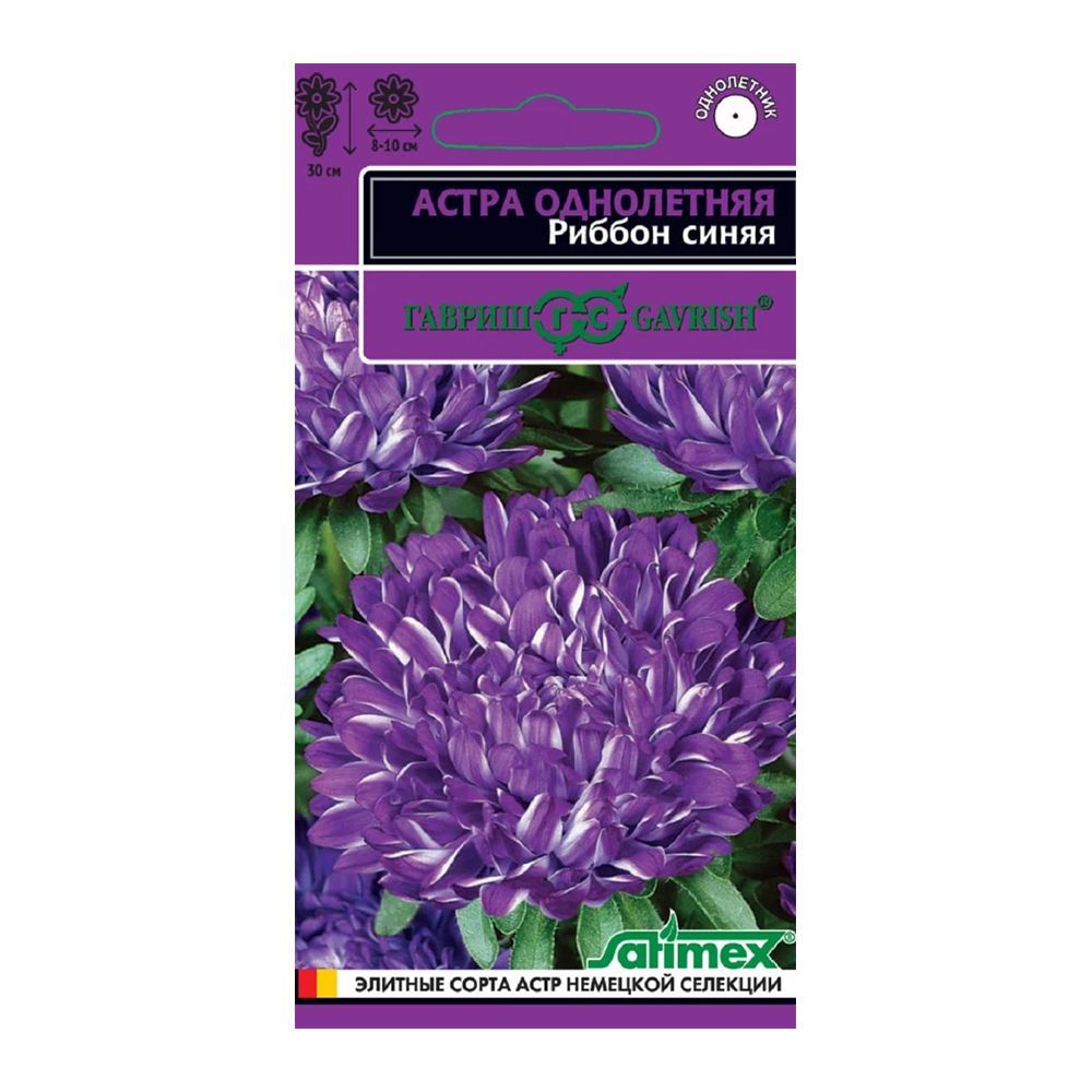 Синие пионовидные соцветия диаметром 8-10 см с ярким акцентом — белой продольной полосой на язычковых цветках. Куст компактный с прочными цветоносами, высотой 30 см. Цветение раннее, обильное и продолжительное. Для выращивания подходят хорошо освещенные участки с плодородной суглинистой или супесчаной почвой. Выращивают чаще всего рассадным способом. Семена высевают в марте-апреле, пикируют с развитием первой пары настоящих листочков по схеме 5х5 см, в открытый грунт рассаду высаживают с середины мая до начала июня. Возможен посев семян в открытый грунт ранней весной или под зиму с последующим мульчированием торфом или опилками. Низкорослые астры серии Риббон станут достойным украшением ваших балконов, вазонов, бордюров, цветников и патио-садиков.