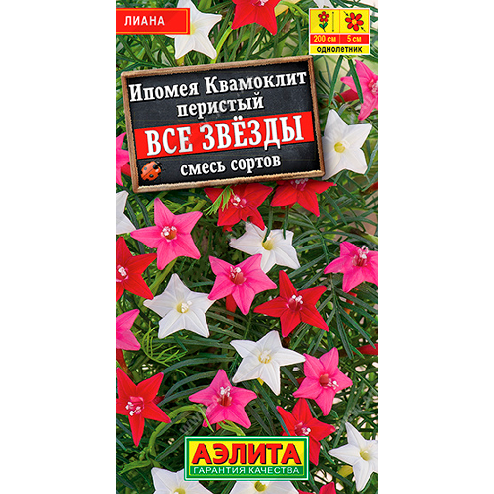 Очень эффектное и необычное вьющееся растение с изящными цветками и ажурными листьями. Популярно у садоводов и известно также как “кипарисная лиана”. Развивается быстро, взбираясь по любой опоре на высоту до 2 м. Образует яркий занавес из воздушной зелени и цветов-звездочек Ø 3-5 см. Ипомея станет изысканным украшением участка, террас, беседок, шпалер и арок. Не требует особого ухода.