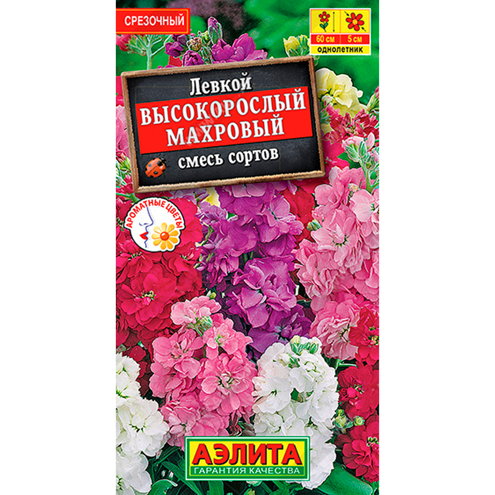 Специальная смесь популярного летника с обильным и продолжительным цветением. Растения высотой 50-60 см. Цветки ароматные, преимущественно махровые, Ø 3-5 см, собраны в длинные колосовидные соцветия. Часть растений будет с немахровыми цветками. Левкои отлично смотрятся на клумбах и в рабатках, идеальны для выращивания возле мест отдыха. Прекрасно подходят для срезки – в воде цветы стоят до двух недель.