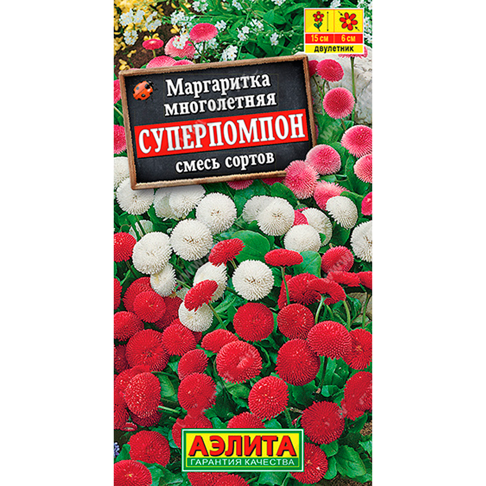 Миниатюрное, двулетнее растение с крупными, густомахровыми соцветия ми-корзинками Ø 4-6 см. Розетки компактные, высотой до 15 см. Цветение обильное и длительное. Маргаритка Суперпомпон неприхотливая, холодостойкая, может расти в небольшом затенении. Широко используется для групповых, бордюрных и ковровых посадок в цветниках. Отлично подходит для выращивания в горшках.