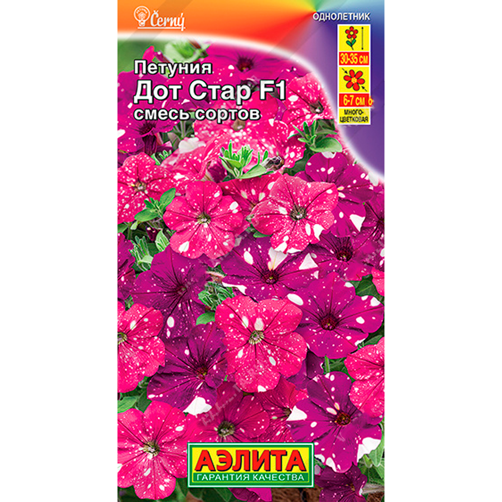 Впервые на рынке из семян! Эксклюзивная петуния чешской селекции от компании ?ern? – одна из самых популярных расцветок. Неповторимая серия гибридов «Дот Стар» представлена многоцветковой петунией с потрясающим, контрастным рисунком лепестков, повторяющим звездное небо. Каждый цветок индивидуален: форма и количество белых вкраплений меняется в зависимости от погодных условий. Растения высотой 30-35 см. Активно растут и развиваются, формируя симпатичные, плотные кустики с большим количеством цветков Ø 6-7 см. Яркая петуния украсит любую клумбу, вазон, подвесное кашпо, став изюминкой вашего сада!