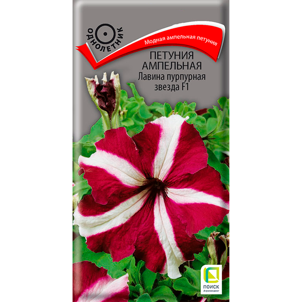 Новая модная группа ампельных петуний! Молодые растения прямостоячие, вырастая, побеги свешиваются и образуют лавину из цветов. Эффектные пурпурно-красные воронковидные цветы с контрастной белой звездой в центре. Цветет обильно с июня по октябрь. Великолепно подходит для подвесных корзин, балконных ящиков.