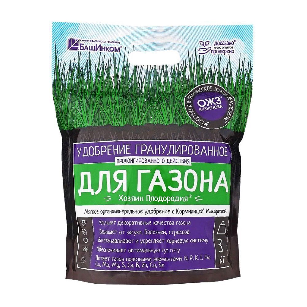 Органоминеральное удобрение "Хозяин Плодородия" с микоризой – это гранулированный препарат пролонгированного действия, предназначенный для ухода за газоном. Его состав включает:
