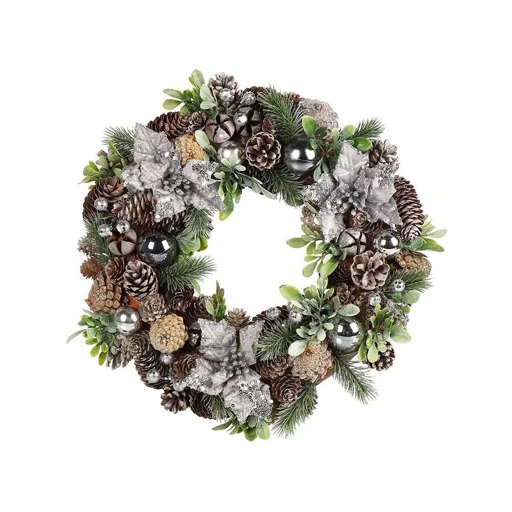 Создайте по-настоящему праздничное настроение в своем доме, ведь Новый год – это время чудес и радости! Привнесите в свой интерьер частичку старинной европейской традиции, украсив его новогодним венком. Этот очаровательный венок, выполненный из натуральных сосновых шишек и украшенный сверкающими деталями, такими как еловые веточки, напоминающие иней, блестящие шарики, бусины и яркие цветы пуансеттии, станет идеальным дополнением к вашему новогоднему декору. Он прекрасно впишется как в общую праздничную атмосферу комнаты, так и станет изысканным элементом сервировки стола.