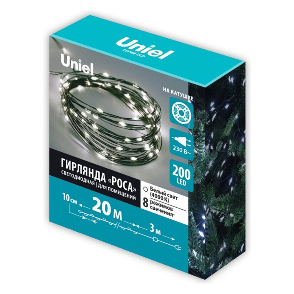 Светодиодная гирлянда "Роса" с классом защиты IP20 и цветовой температурой 4000К – это универсальное решение для декоративного оформления помещений. Гирлянды Uniel помогут создать неповторимую атмосферу праздника. Модель оснащена контроллером с 8 режимами свечения, которые легко переключаются последовательным нажатием кнопки: от комбинированного и волнообразного до мерцающего и постоянного. Важным преимуществом является надежность: гирлянда сохраняет работоспособность даже при выходе из строя одного из светодиодов.